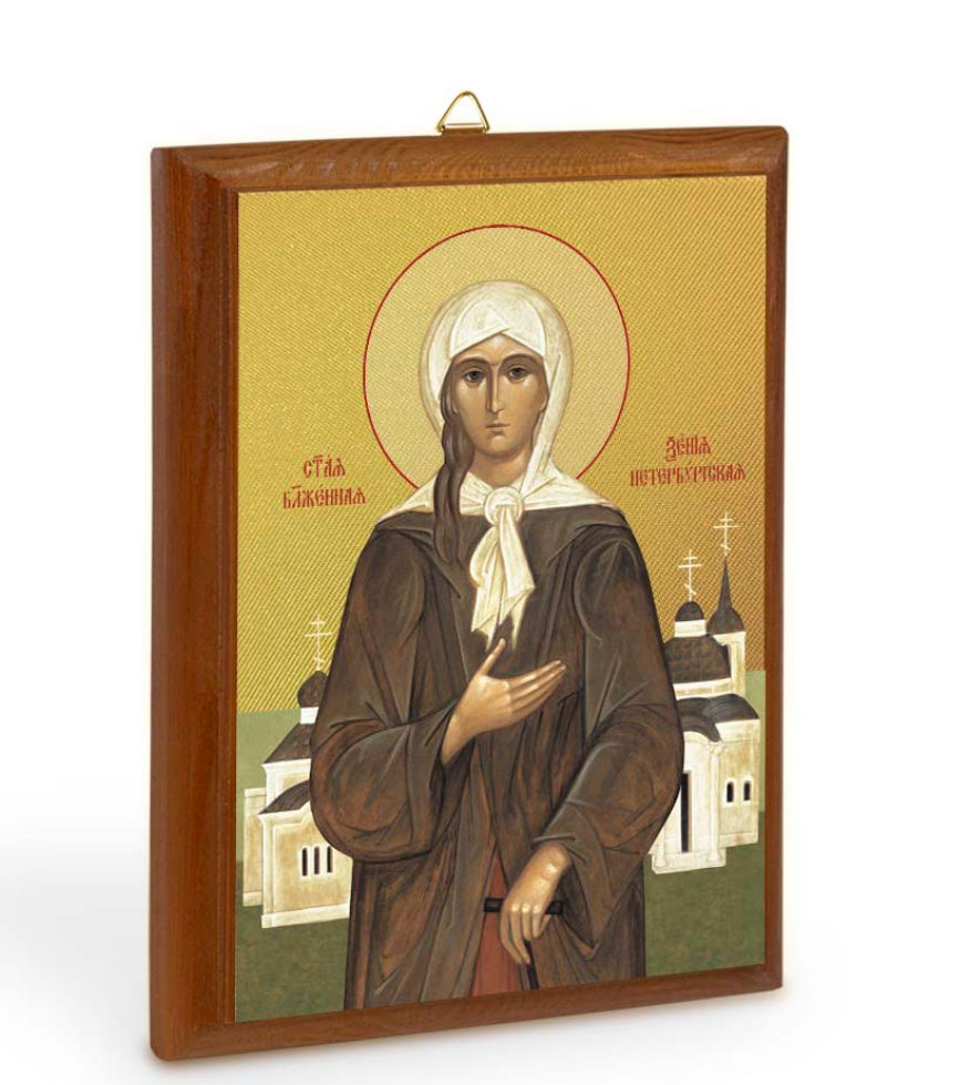 Blessed Xenia of St Petersburg icon on a wooden base. Icon is printed onto canvas with gold gilding. Wall mount on reverse side for hanging. All icons are blessed.