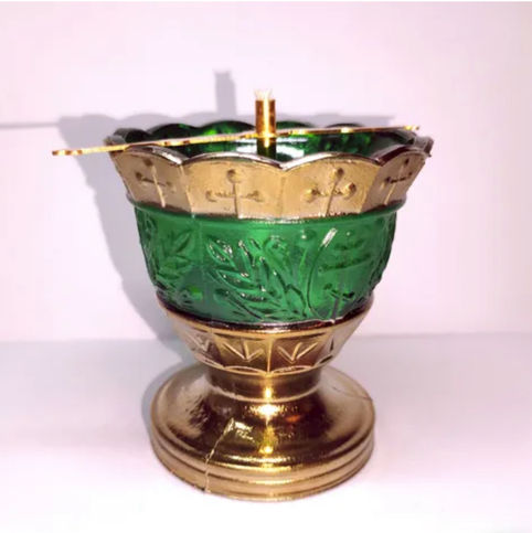 Emerald green vigil lamp with gold accents. Includes wick holder. Made in Russia.