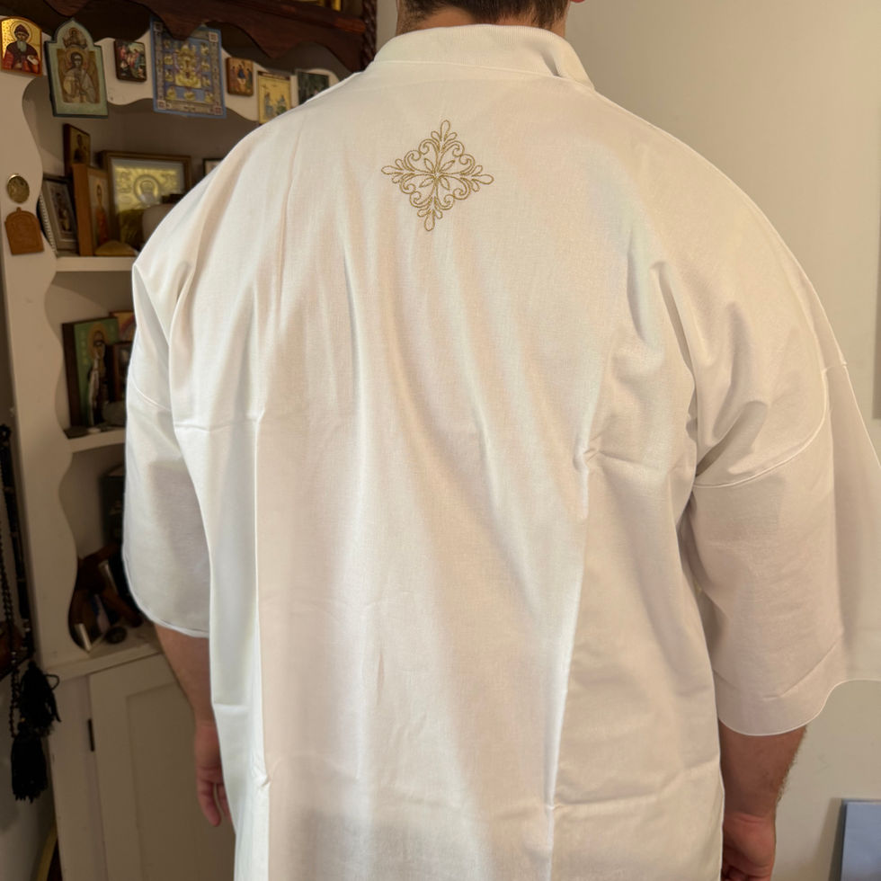 Men’s cotton Christening gown. White with gold cross detail on back. Made in Belarus.