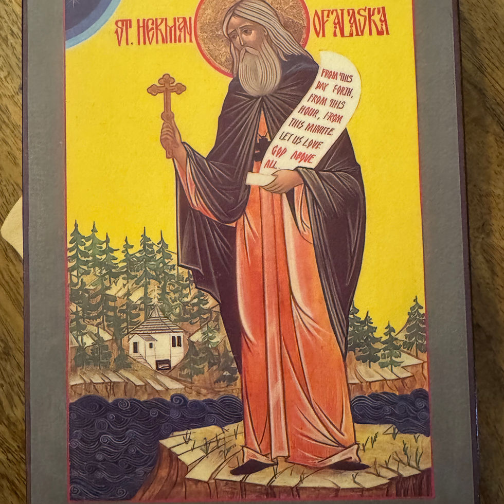 St Herman of Alaska icon on wooden board. English text. Icon comes with small wooden stand.