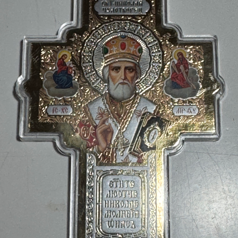 St Nicholas icon encased in plastic cross with adhesive strip. Can be used in car/vehicle or home.