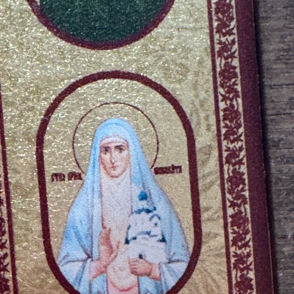 This arch triptych is made from wood with printed icons of Christ Pantocrator (in the center), the Mother of God, St. Nicholas, St Seraphim, St Sergius, St. Matrona and St Elizabeth. The printed icons are on a thin layer of gold leaf.